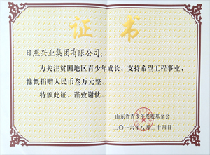 ·2016年8月24日,山東省青少年發(fā)展基金會(huì)為興業(yè)集團(tuán)頒發(fā)“關(guān)注貧困地區(qū)青少年成長,支持希望工程事業(yè),慷慨捐贈(zèng)人民幣3萬元”榮獲證書。